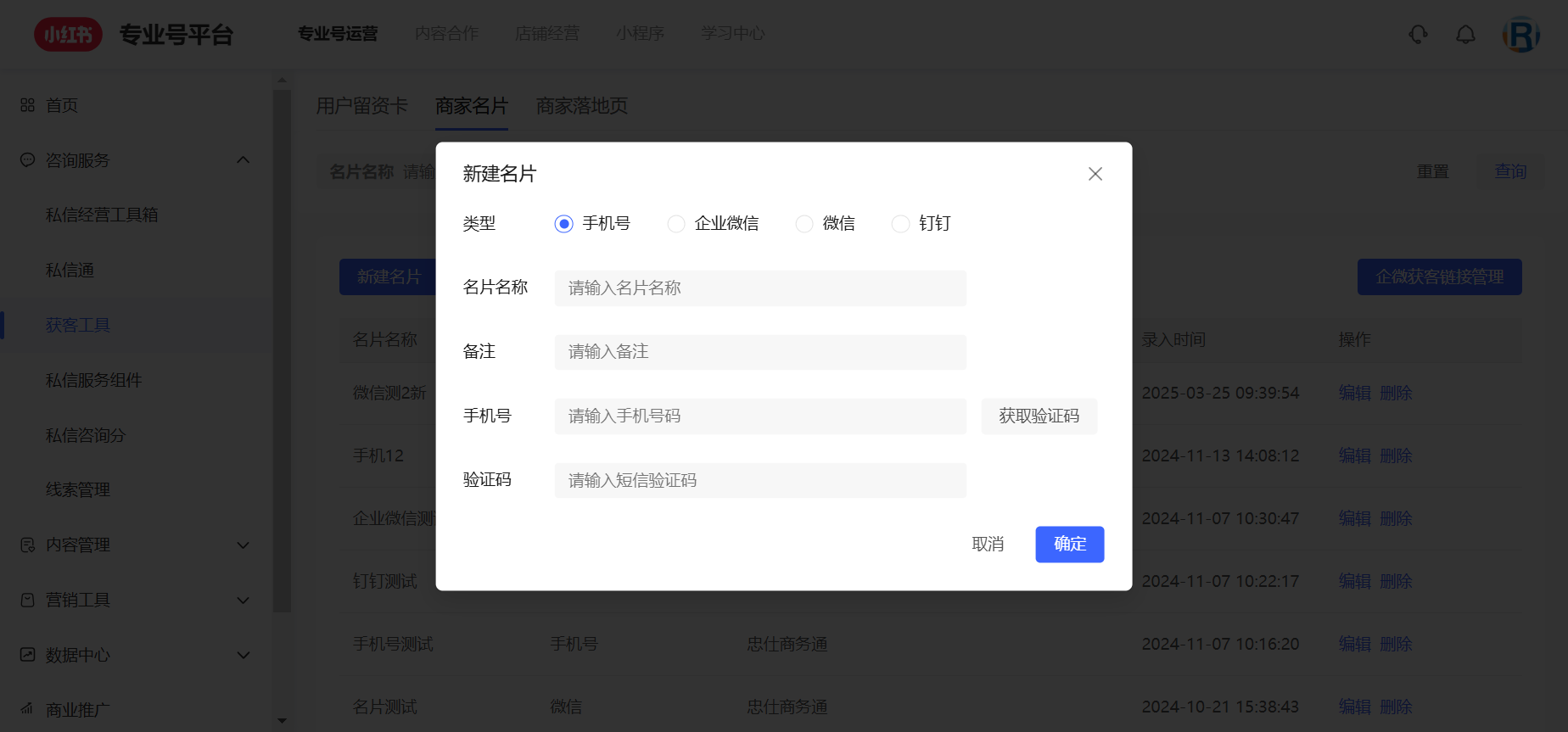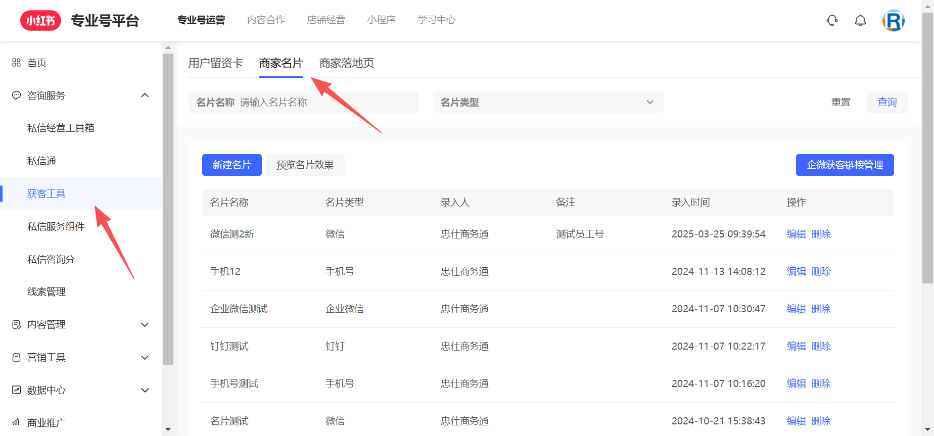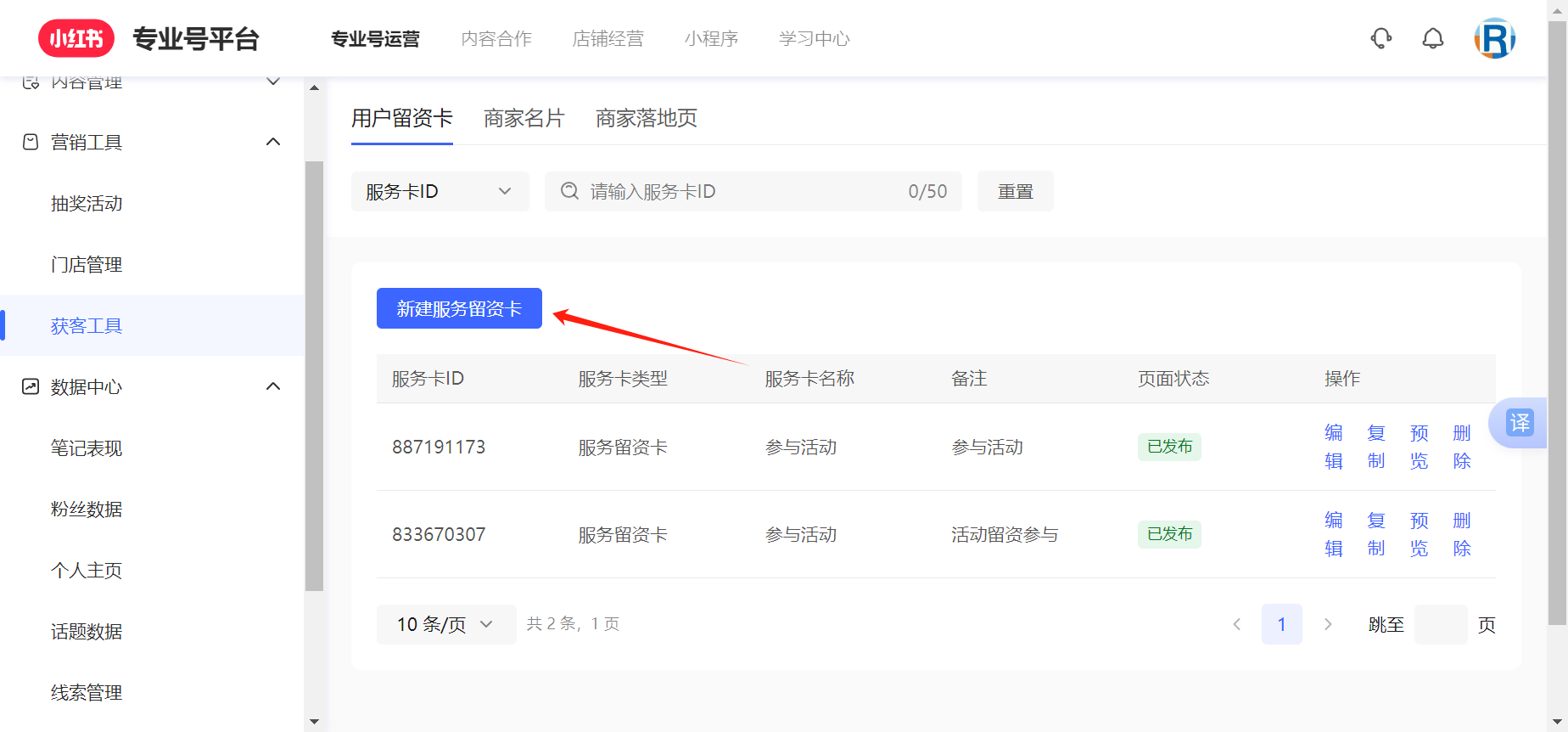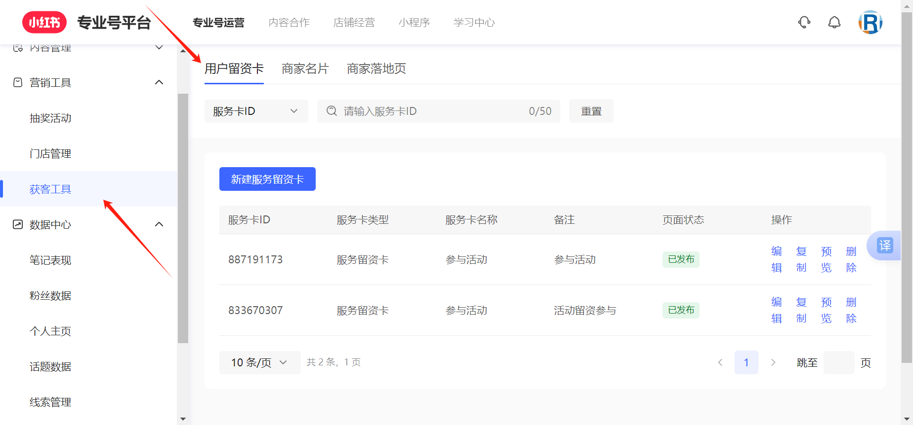 前往专业号平台,找到“咨询服务”下的“获客工具”,如果没有“获客工具”商家名片这栏说明账号消耗不达标,建议咨询小红书侧。