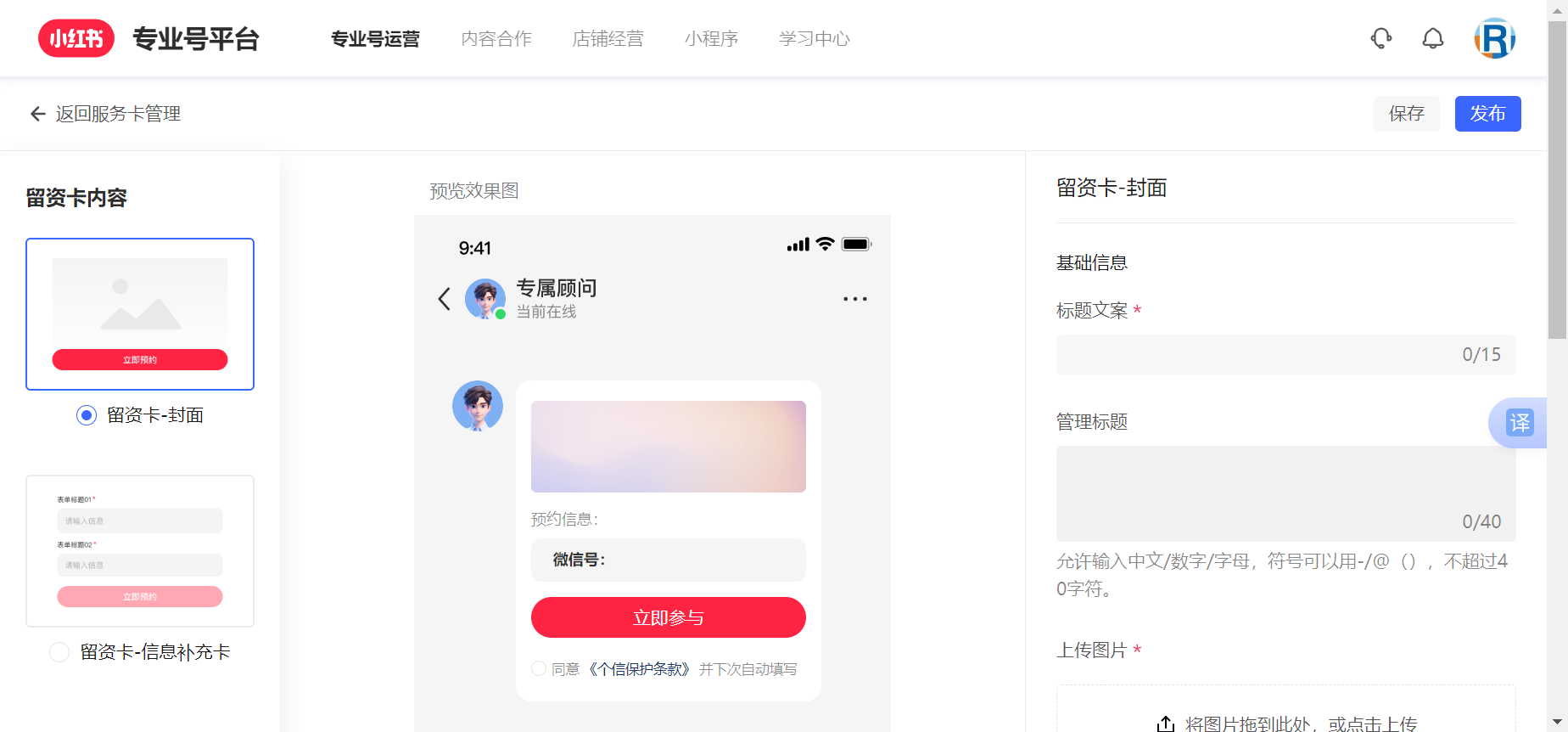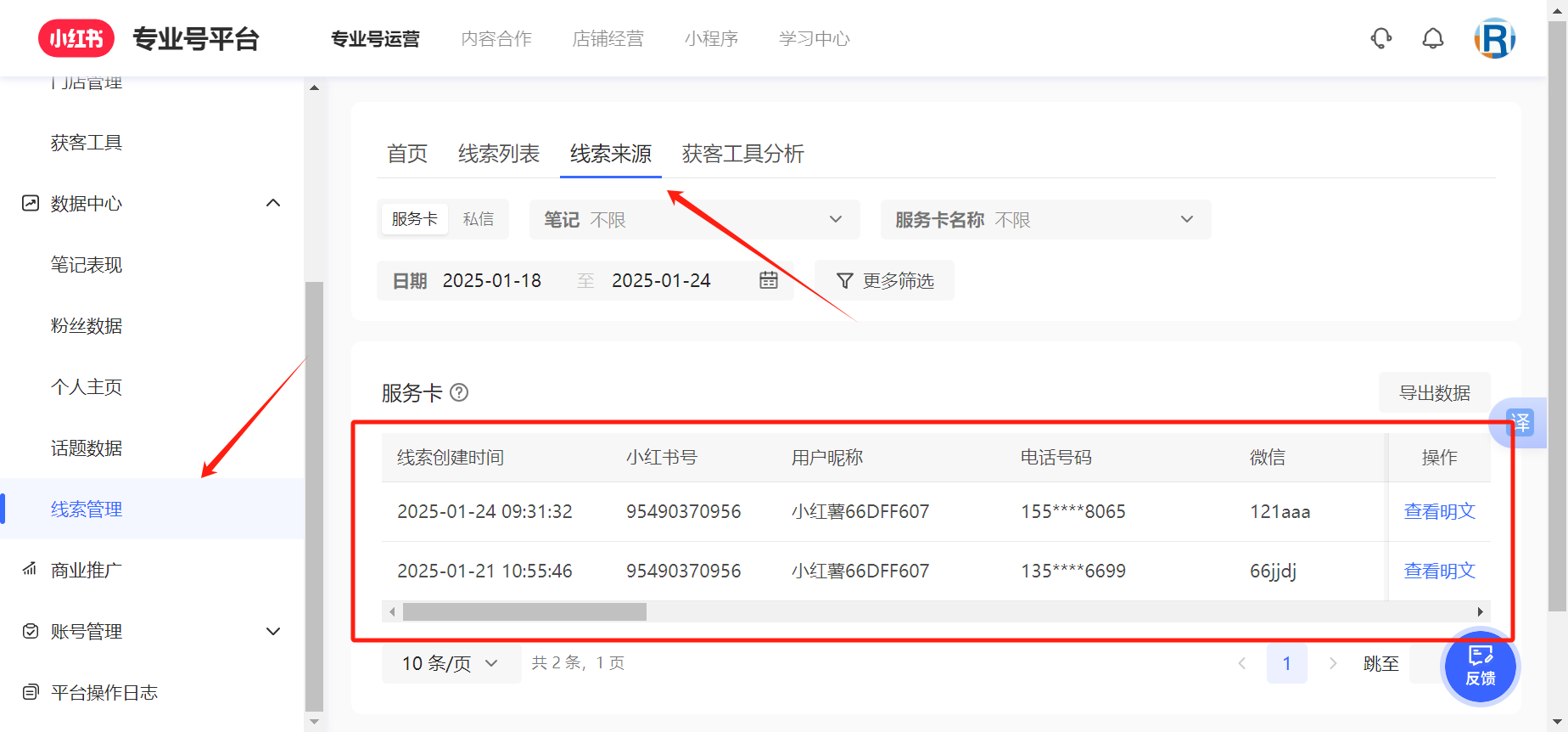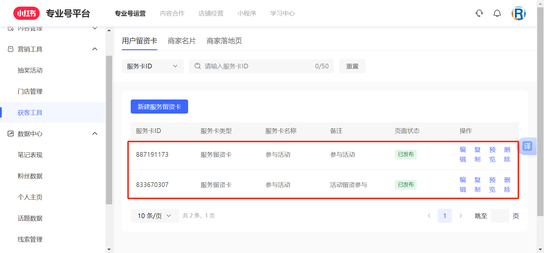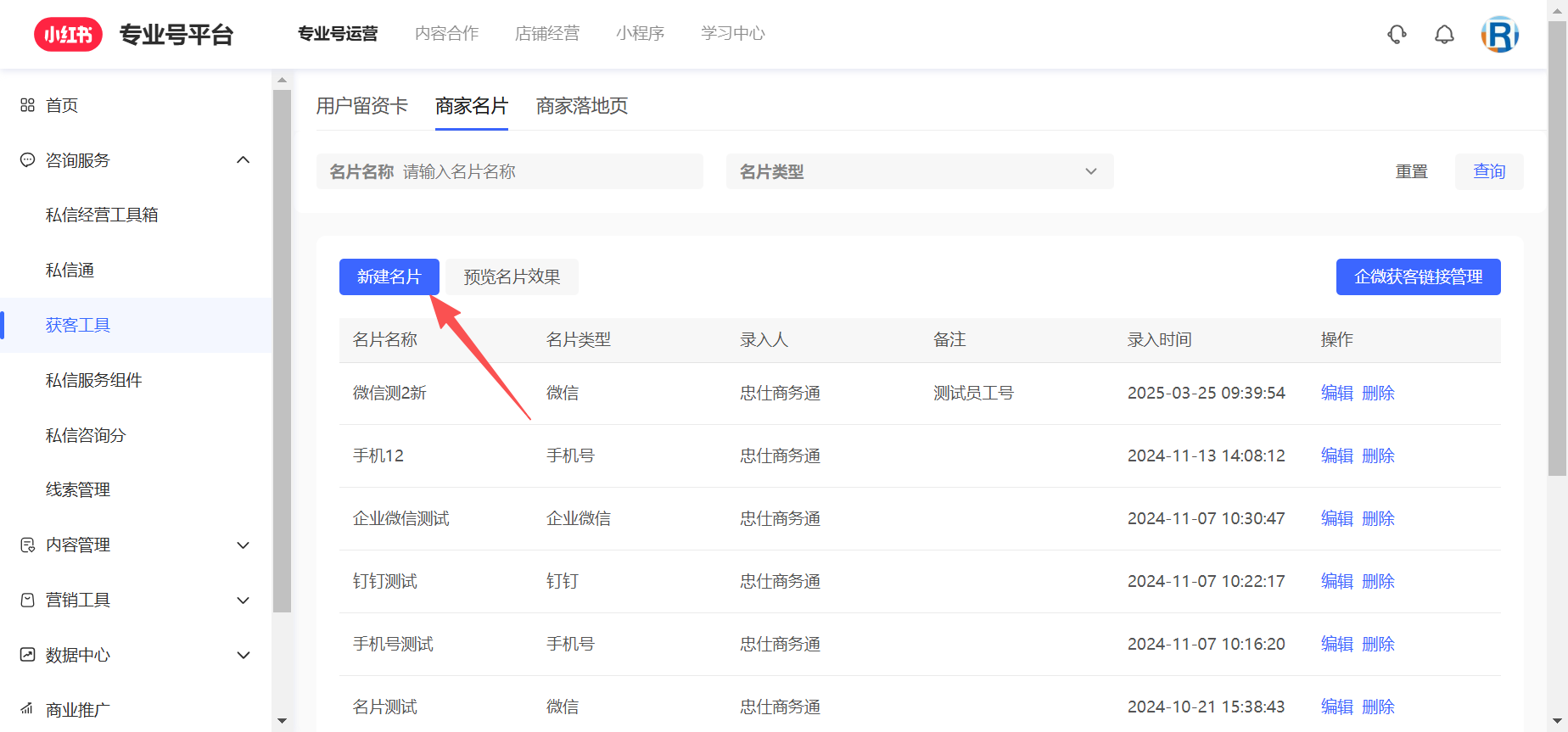 前往专业号平台,找到“咨询服务”下的“获客工具”,如果没有“获客工具”商家名片这栏说明账号消耗不达标,建议咨询小红书侧。