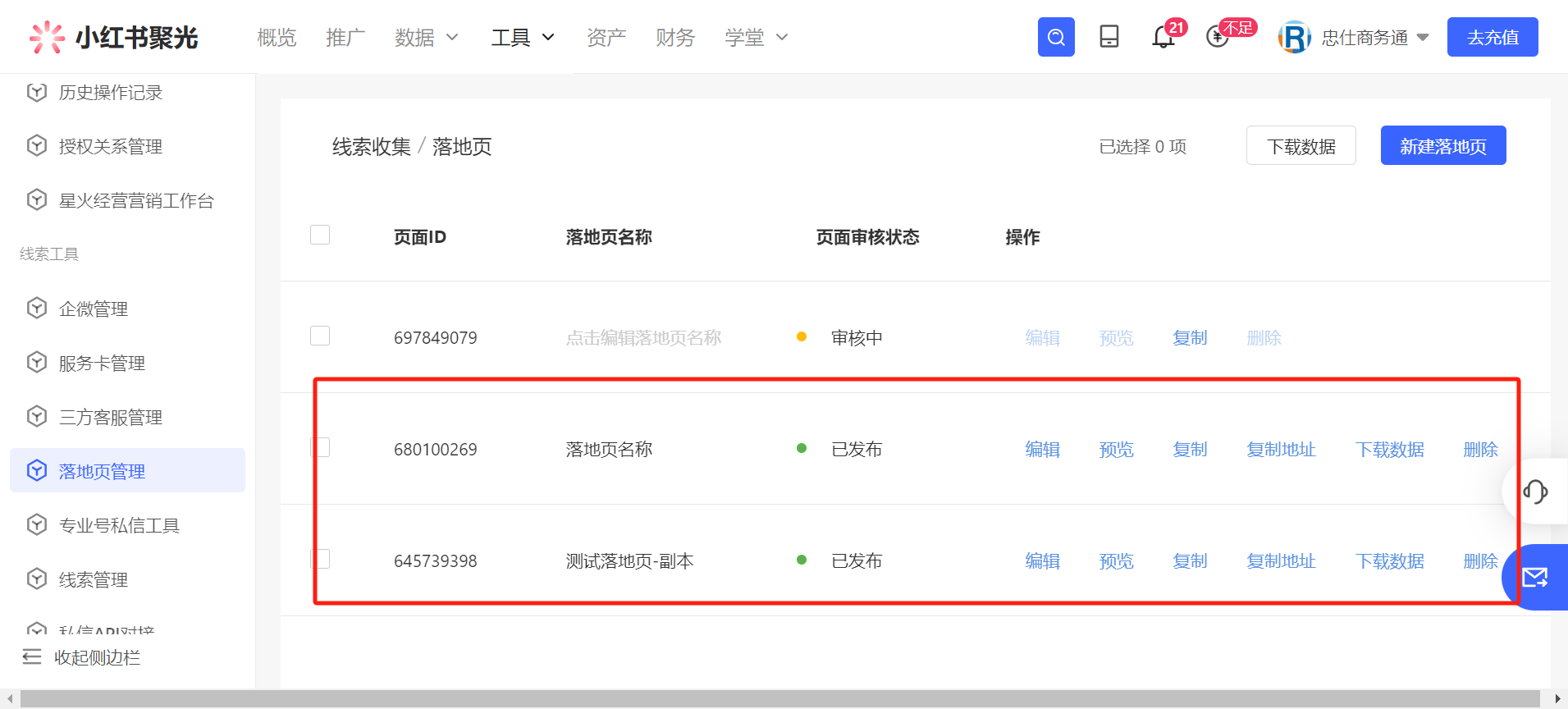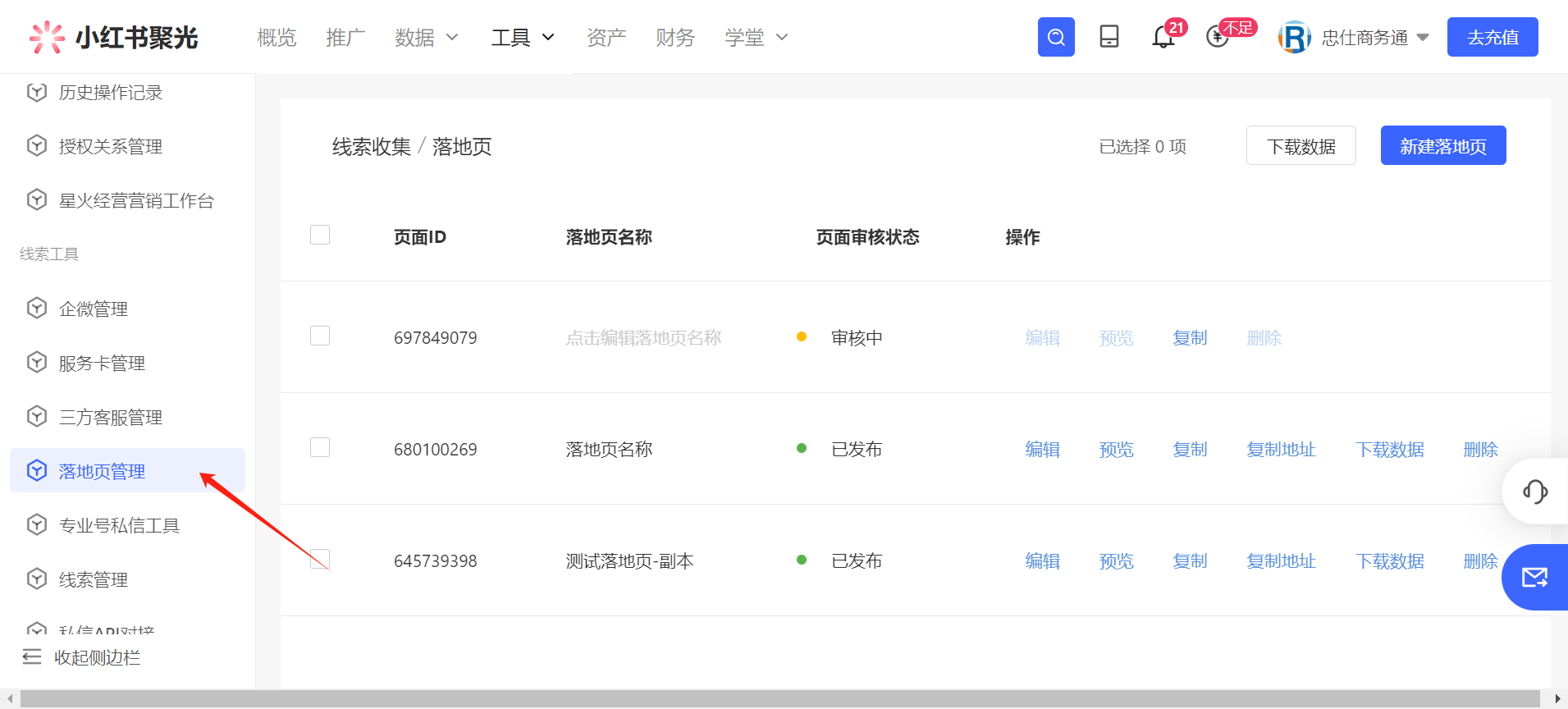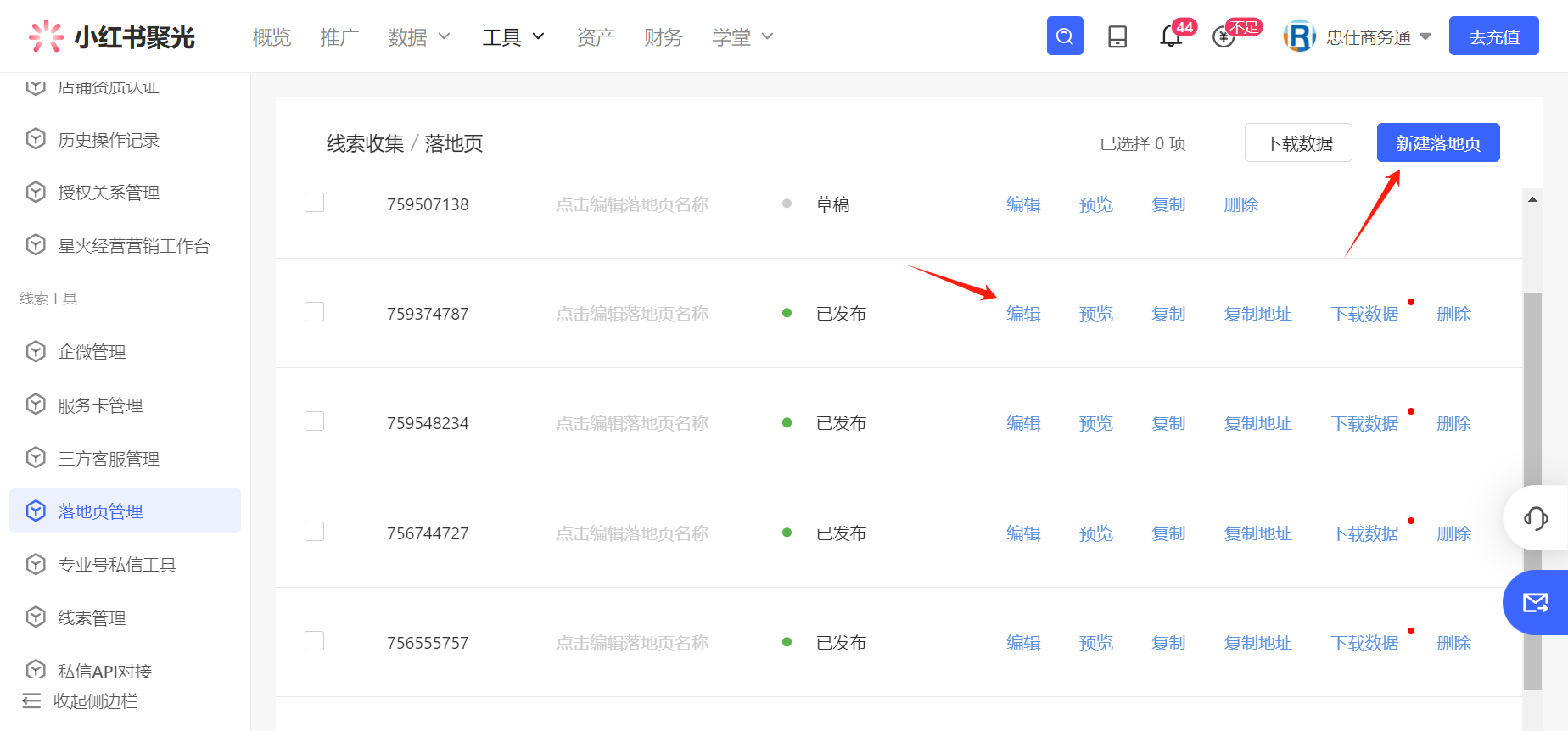 (1)前往聚光平台,找到落地页管理,需要的落地页进入编辑或者新建